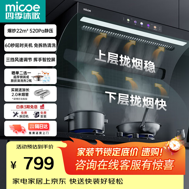 四季沐歌油烟机家用顶侧双吸抽油烟机大吸力厨房抽烟机脱排油烟机免拆自清洗抽烟机一级能效侧顶吸油烟机 [爆款热销]D50-22爆吸|挥手启动|热清洗