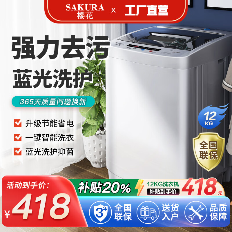 樱花10KG全自动洗衣机家用洗脱一体机大容量公斤智能波轮强风干宿舍迷你小型智能洗脱一体大容量 12.0KG 蓝光洗护 热风干 10年质保