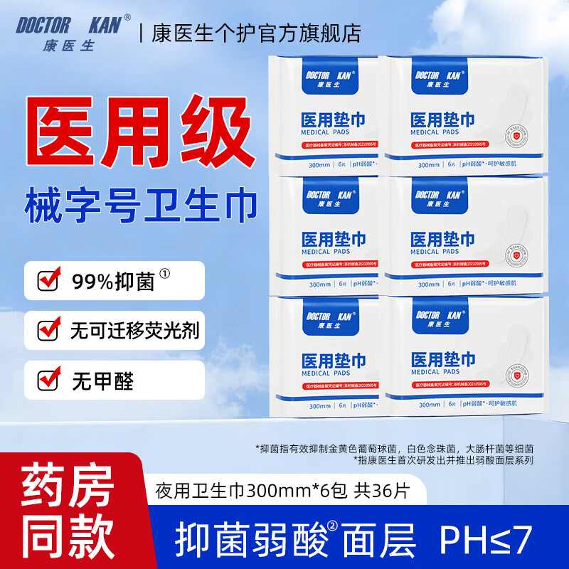康医生医用垫巾卫生巾护理垫组合弱酸面层日夜用姨妈巾轻薄透气护垫套装 夜用卫生巾300mm*6包【共36片】【赠安睡裤2条】