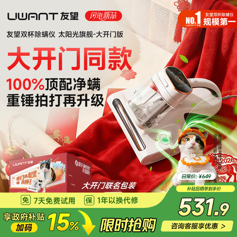 UWANT友望除螨仪床宝 大吸力紫外线杀菌双杯尘螨分离家用床上宠物除螨机超声波去螨吸尘神器 宠物家庭 太阳光旗舰【大开门联名款】