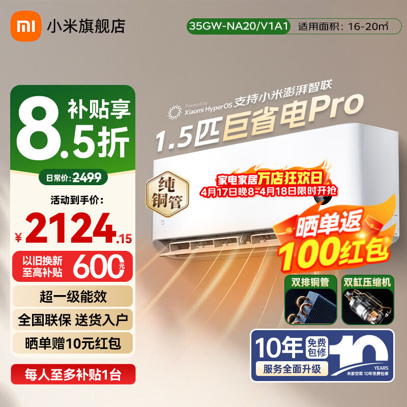 小米(MI)空调1.5匹 巨省电 新一级能效 变频冷暖智能自清洁壁挂式空调挂机26年双排纯铜管 十年质保 巨省电pro 1.5匹 2025款双缸压缩机