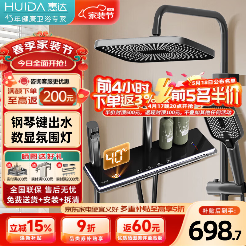 惠达卫浴淋浴花洒套装精铜主体增压花洒家用卫生间沐浴洗澡惠达花洒 DW13数显氛围灯【精铜】加大置物