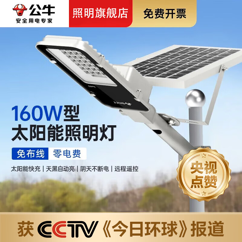 公牛(BULL)太阳能户外照明灯新款大功率庭院灯农村用天黑自动亮防水led路灯 标亮160W型+光感+遥控+照约40平