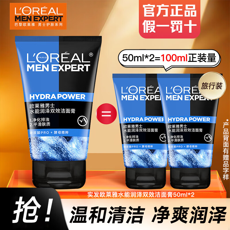 欧莱雅(LOREAL)男士洗面奶控油磨砂抗黑头深层清洁面乳男小巧户外便携 水能双效洁面 50ml *2瓶