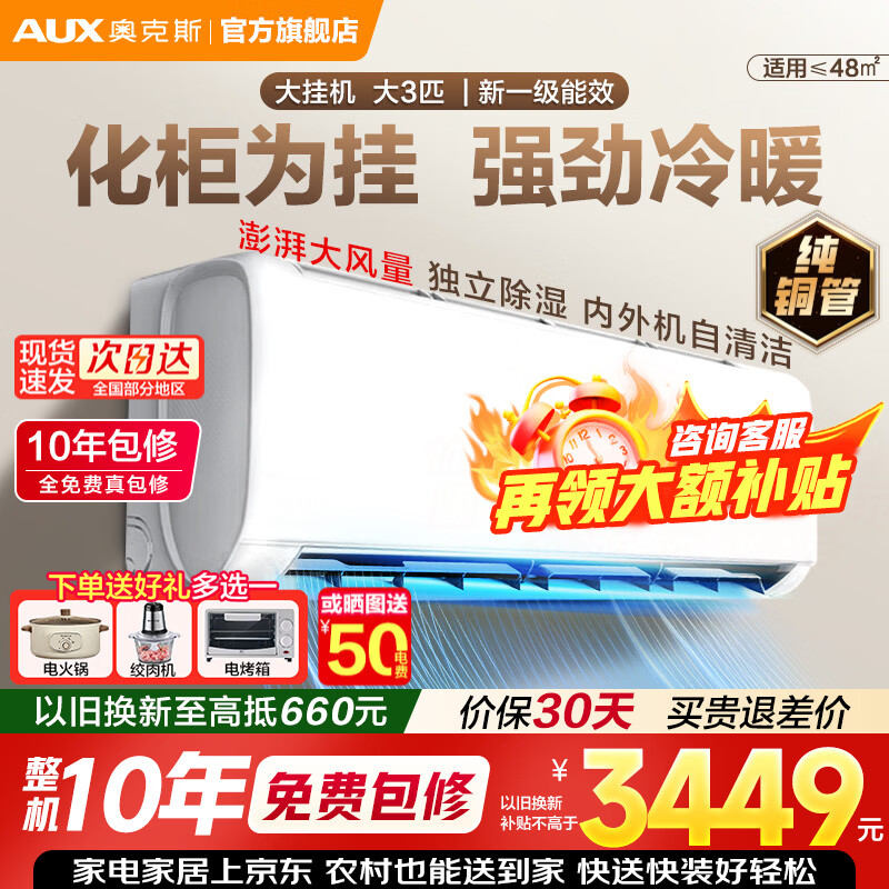 奥克斯(AUX)空调2匹大挂机新一级能效家电补贴15%变频冷暖壁挂式防直吹家用大卧室客厅商居两用自清洁以旧换新 3匹 一级能效【大挂机】wifi智控 澎湃大风量