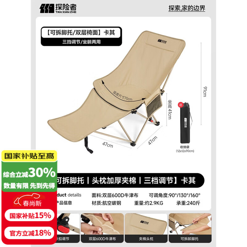 探险者月亮椅户外折叠椅露营椅子高靠背便携高背钓鱼野餐沙滩桌椅全装备 【带可拆脚托-三档调节加厚头枕】卡其