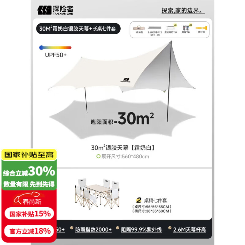 探险者(TAN XIAN ZHE)天幕帐篷露营天幕户外8-10人露营装备全套防晒蝶形防雨防风遮阳棚 【30㎡】银胶天幕+长桌七件套