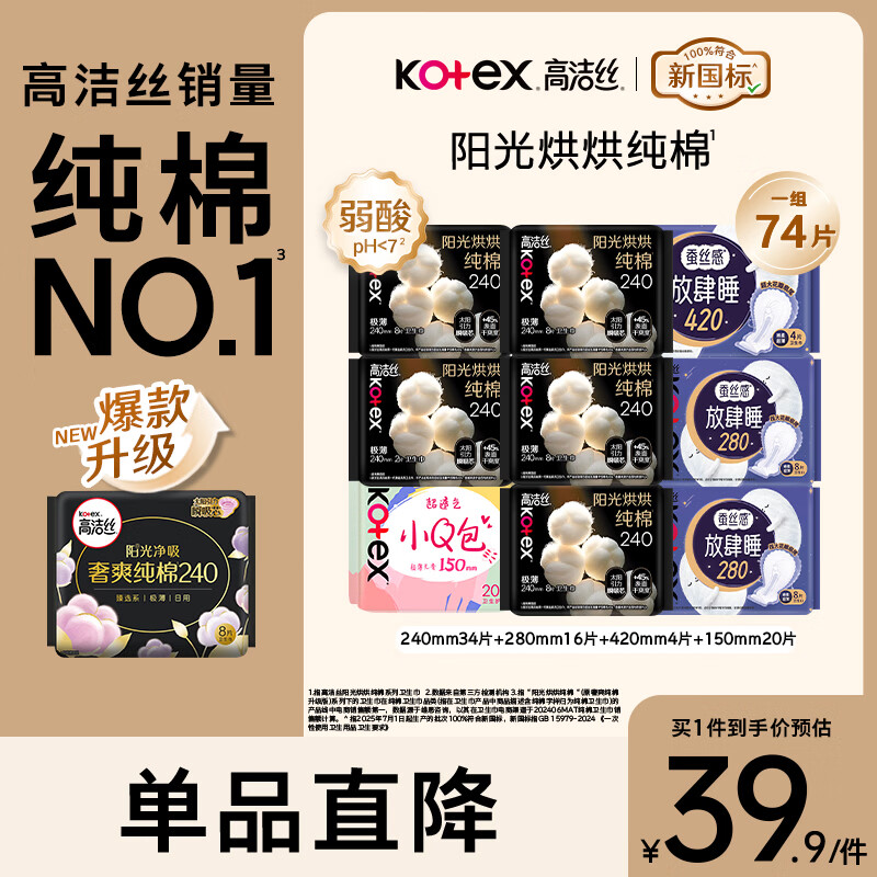 高洁丝(Kotex)卫生巾 臻选纯棉日夜套装极薄透气无感 组合装 【热卖】日夜组合74片