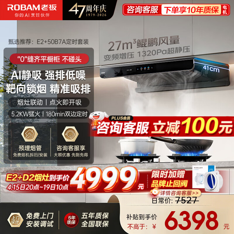 老板(Robam)【升级款E2+D2特价】抽吸油烟机燃气灶套装 家用欧式顶吸27风量吸力1320Pa静压 烟灶套装 一级能效 【两件套】E2+50B7A定时联动灶5.2kw
