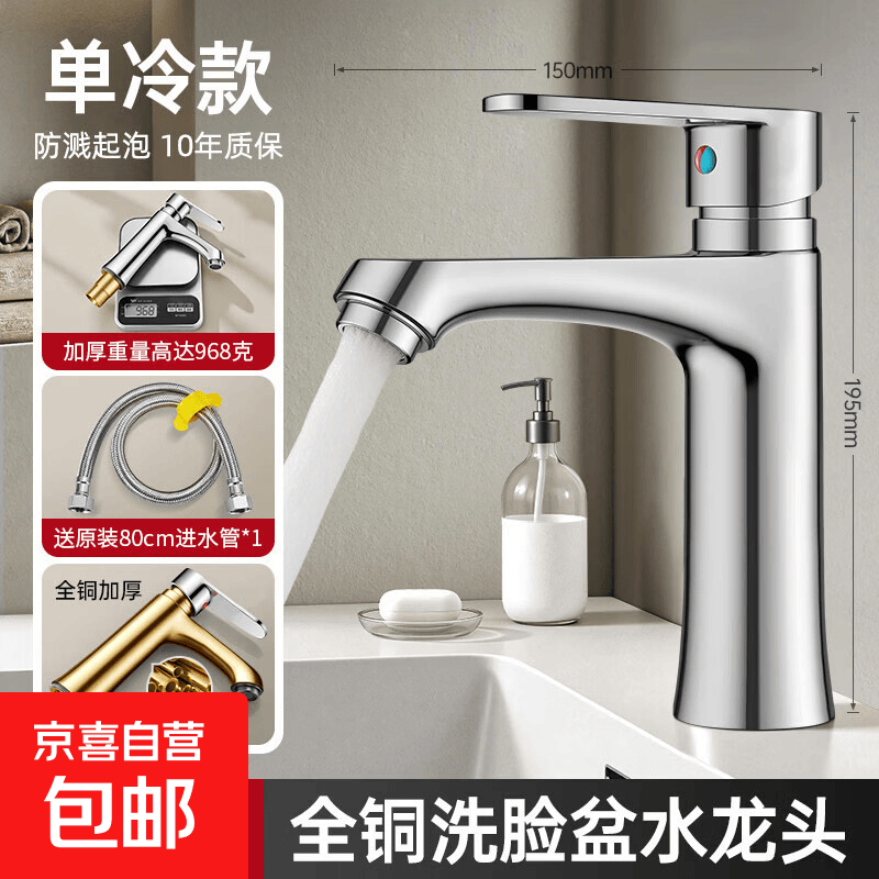 九牧王全铜洗手盆水龙头面盆卫生间洗脸池台水龙头冷热水器二合一 【单冷款】亮银|加厚加重精铜主体 起泡防溅水嘴丨送不锈钢进水管