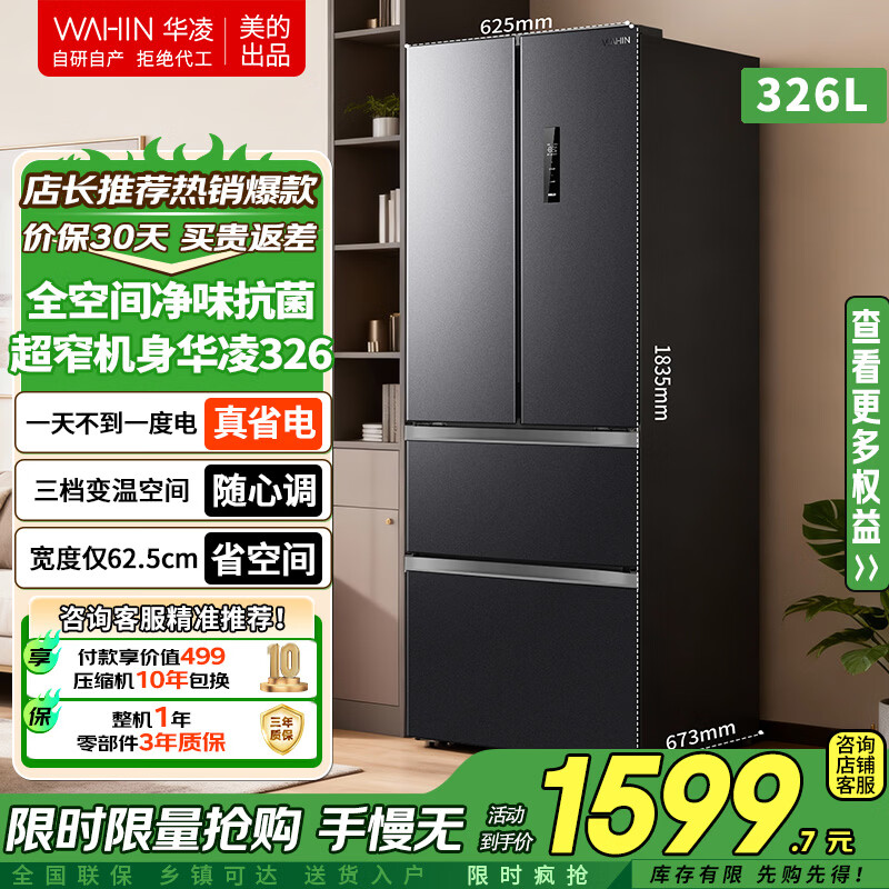 美的325冰箱法式多门四开双开门变频一级能效无霜公寓家用小户型厨房超薄电冰箱换新补贴 【华凌326】BCD-326WFPH