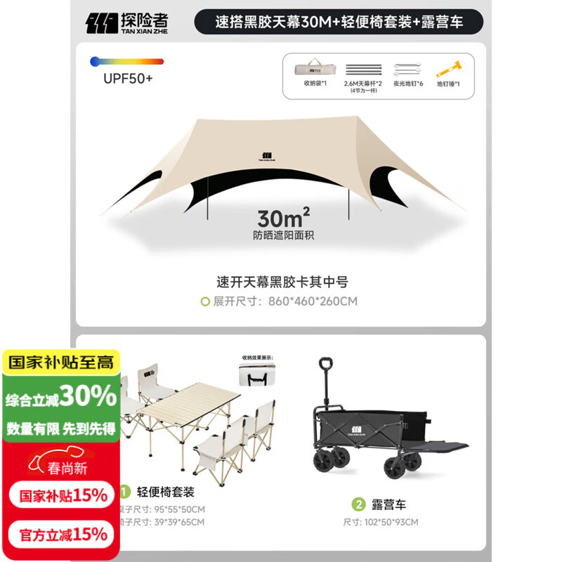 探险者(TAN XIAN ZHE)天幕帐篷户外露营车载便携六角防晒速开懒人天幕野营遮光遮阳棚 【轻便露营】30㎡天幕+轻便椅套装+推车