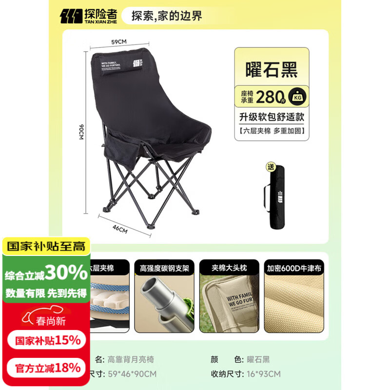 探险者月亮椅户外折叠椅露营椅子高靠背便携高背钓鱼野餐沙滩桌椅全装备 升级舒适款黑色【六层夹棉】