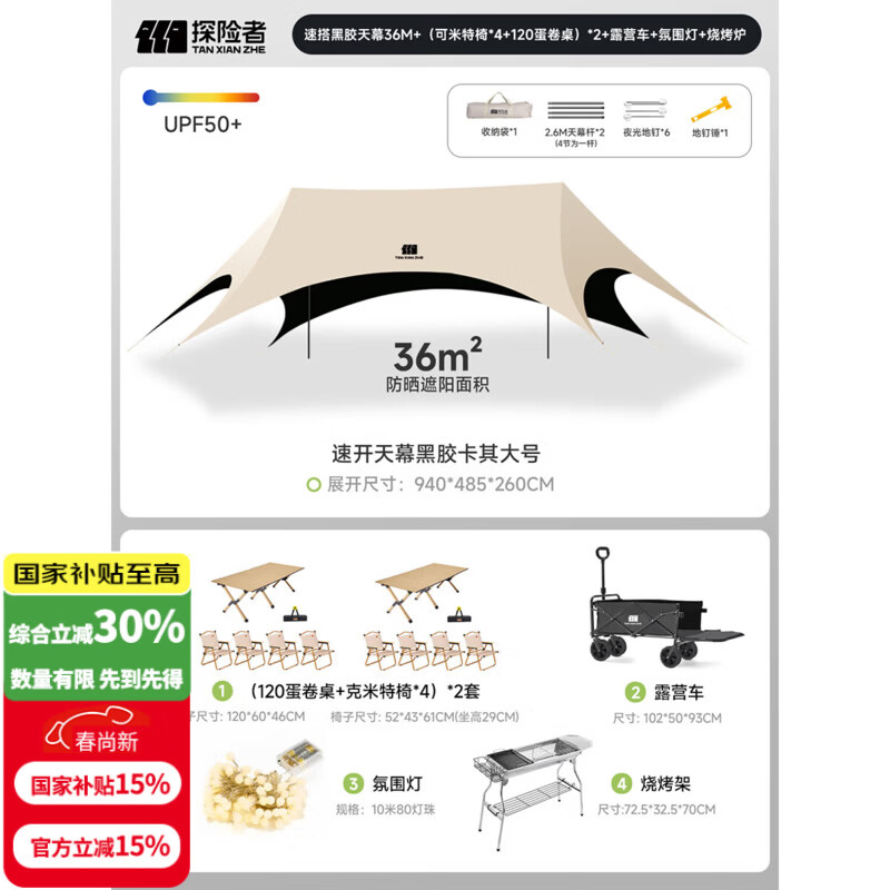 探险者(TAN XIAN ZHE)天幕帐篷户外露营车载便携六角防晒速开懒人天幕野营遮光遮阳棚 36㎡黑胶天幕【露营烧烤一套配齐 】