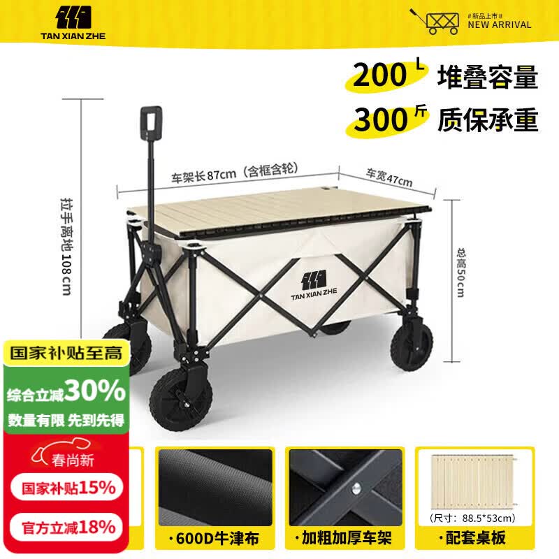探险者露营车折叠推车户外露营儿童小推车营地车拉年货小拖车聚拢型推车 200L 珍珠白-3CM静音轮+配套桌板