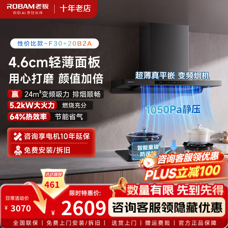 老板(Robam)【升级环吸大云板】F30油烟机灶具节能烟灶套装 厨房顶吸欧式24大风量 变频电机家用1050Pa大吸力 【性价比套装】烟机F30+星辰灶20B2A