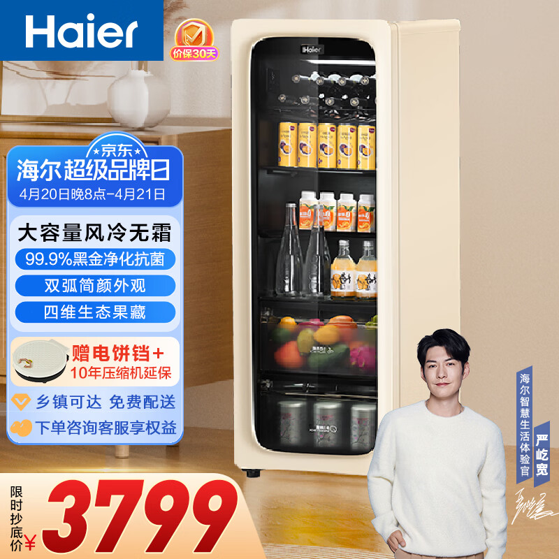 海尔(Haier)冰吧家用小型迷你冰箱客厅办公室卧室单门饮料茶叶水果红酒冷藏保鲜展示柜透明玻璃门超薄立式冰柜 全冷藏元气吧丨风冷无霜丨象牙米 200升