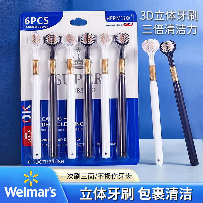 HERM'S【沃尔玛三面软毛】包裹成人牙刷护龈全面包裹清洁成人男女士家庭 山姆三面卡装 6支