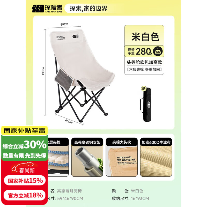 探险者(TAN XIAN ZHE)户外折叠椅露营椅子月亮椅便携折叠桌椅高靠背躺椅小凳子钓鱼椅 加高软包头等舱米白【头部可靠】