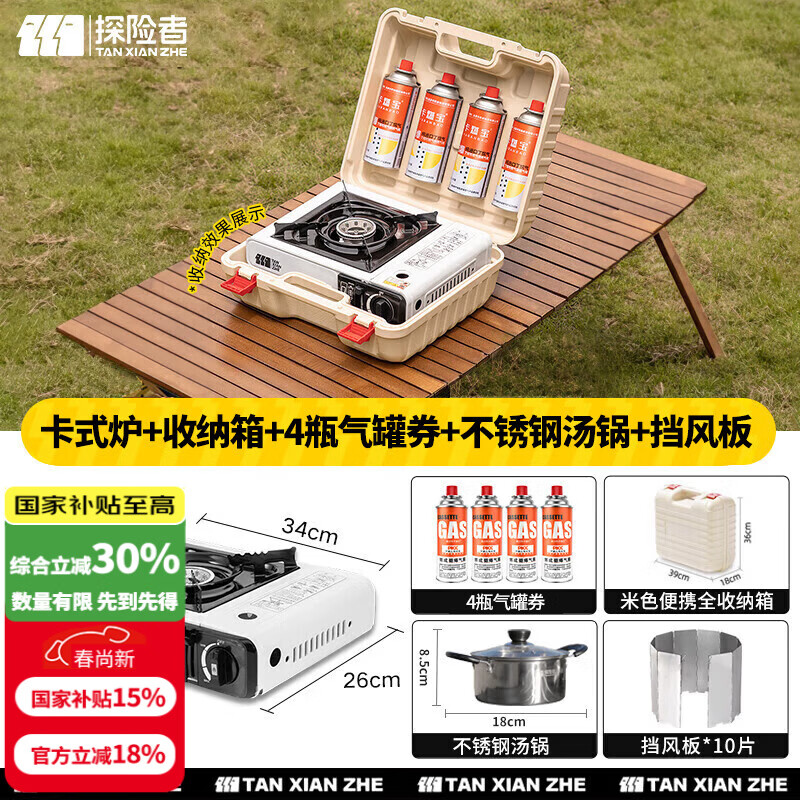 探险者(TAN XIAN ZHE)卡式炉户外野外炉具炊具卡斯炉一体便携式卡磁煤气瓦斯露营燃气灶 炉+箱+气券(赠品)*4+汤锅+挡风板