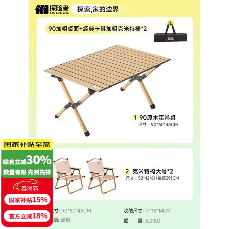 探险者(TAN XIAN ZHE)户外蛋卷桌折叠桌便携式桌椅套装露营桌子一套野餐桌装备全套摆摊 90稳固木色桌+2*经典卡其克米特椅