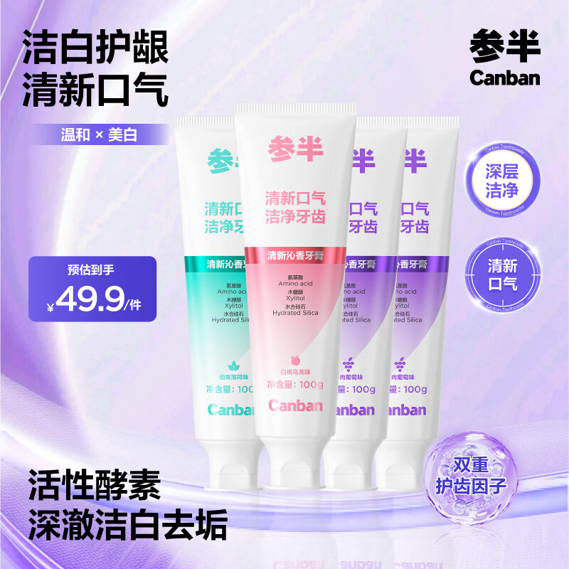 参半清新沁香牙膏酵素洁白去渍清新口气温和清洁 白桃+葡萄*2+薄荷 100g*4支