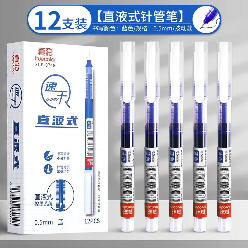 真彩直液式中性笔黑色0.5mm全针管速干大容量巨能写商务办公走珠签字笔学生文具考试刷题笔水笔 【记忆笔】12支-蓝色 0.5mm