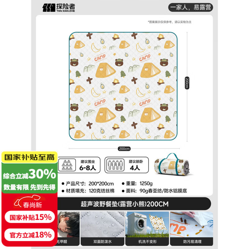 探险者(TAN XIAN ZHE)野餐垫户外加厚超大便携露营垫春游野炊草坪地垫防水防潮垫爬行垫 【7层加厚不硌人】露营小熊200*200cm【厚约5mm】