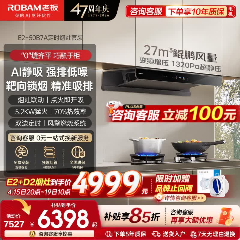 老板(Robam)【抢烟灶热6999】双子星E2机皇27风量欧式抽吸油烟机燃气灶具套装智能巡航增压1320Pa挥手智控 【两件套】烟机+5.2kW高端定时灶50B7A