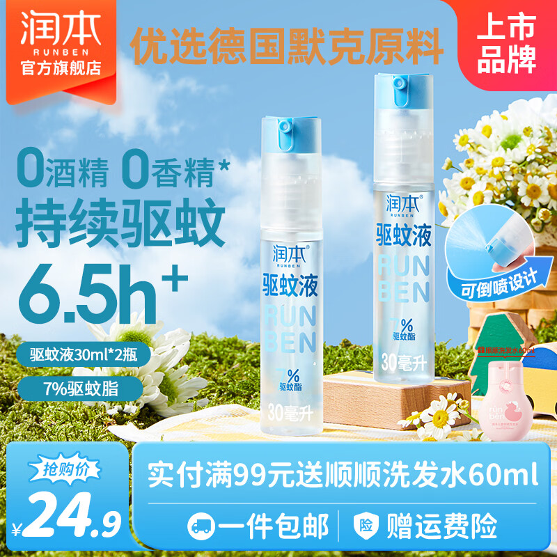 润本驱蚊液驱蚊喷雾防蚊液花露水户外防蚊虫叮咬驱蚊水蚊怕水防蚊喷雾 30ml 2瓶 【驱蚊5.7h】7%驱蚊酯