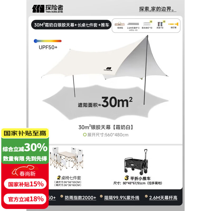 探险者(TAN XIAN ZHE)天幕帐篷露营天幕户外8-10人露营装备全套防晒蝶形防雨防风遮阳棚 【30㎡】天幕+长桌七件套+推车