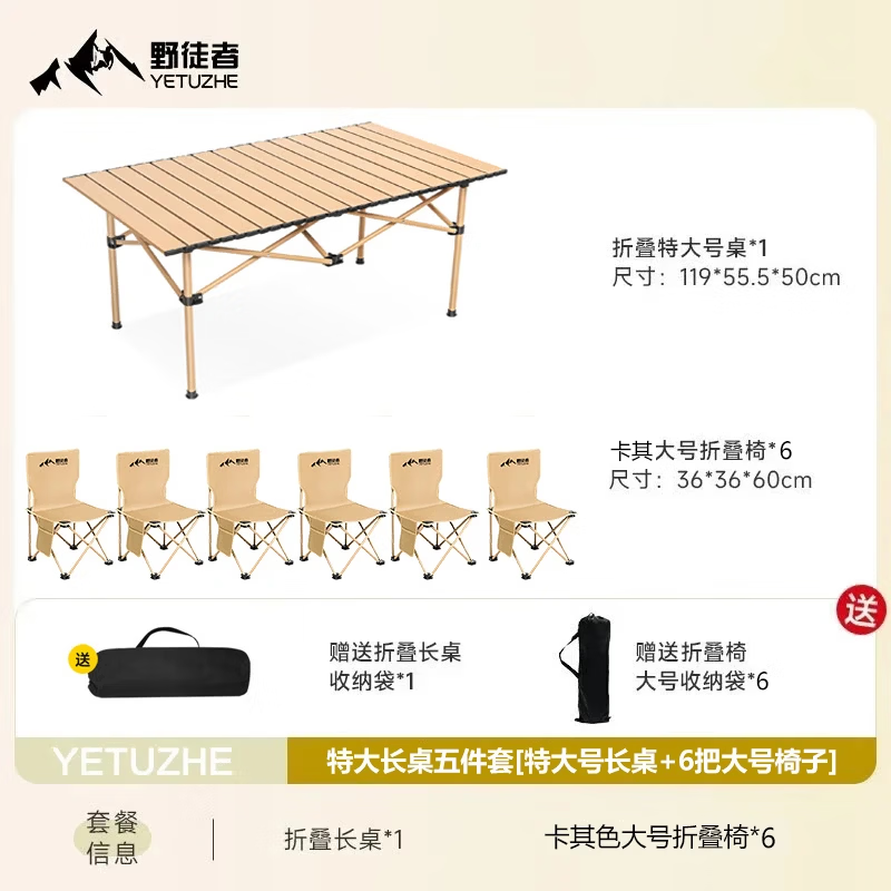 野徒者露营桌椅全套户外桌椅折叠椅野餐一桌四椅户外露营装备野炊蛋卷桌 120cm7件套【卡其长桌+6把椅子】 新款升级