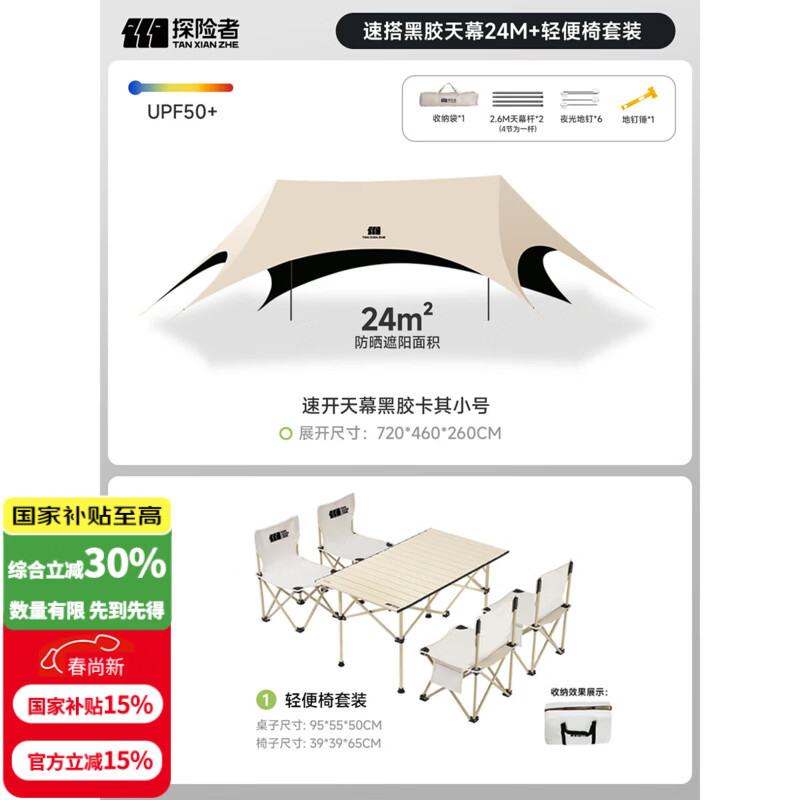 探险者(TAN XIAN ZHE)天幕帐篷户外露营车载便携六角防晒速开懒人天幕野营遮光遮阳棚 速搭黑胶天幕24㎡+轻便椅套装
