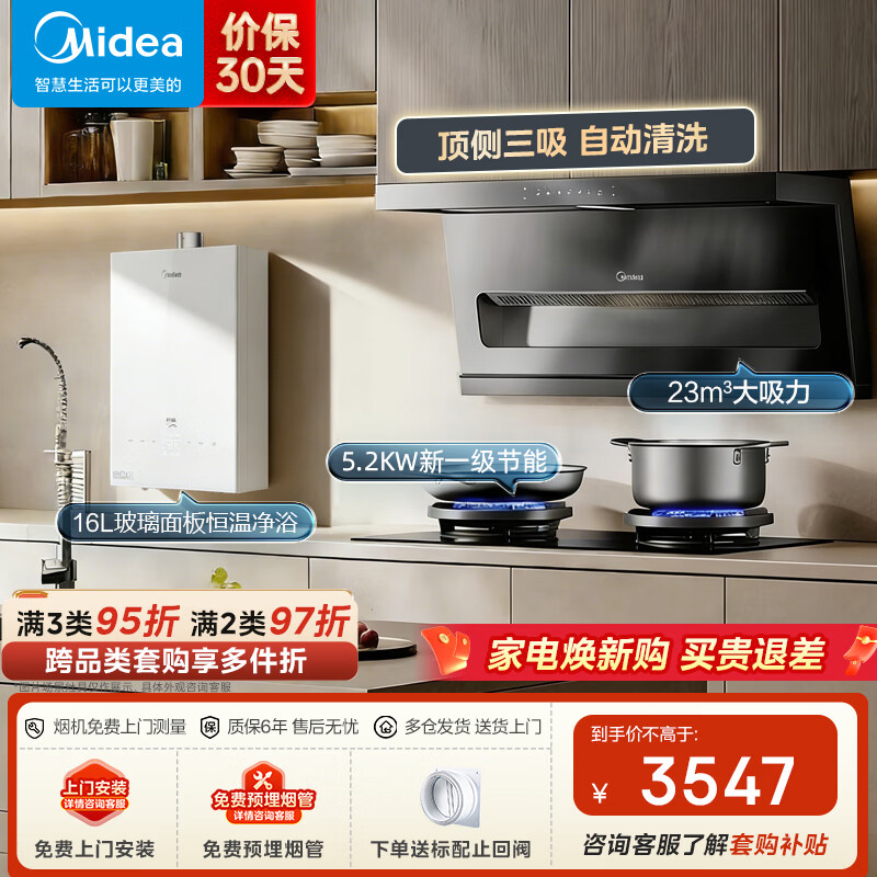 美的(Midea)顶侧三吸油烟机 23立方爆炒大吸力 7字型烟机自动清洗挥手智控家用抽油烟机炉灶燃气灶套装DP55 【烟灶热】配5.2KW灶A3+恒温净浴玻璃面板热水-天然气