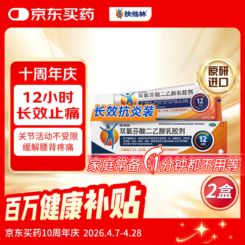 【原研进口】扶他林 双氯芬酸二乙胺乳胶剂 2%*50g 2盒装 缓解肌肉关节疼痛软组织扭伤拉伤挫伤骨关节炎