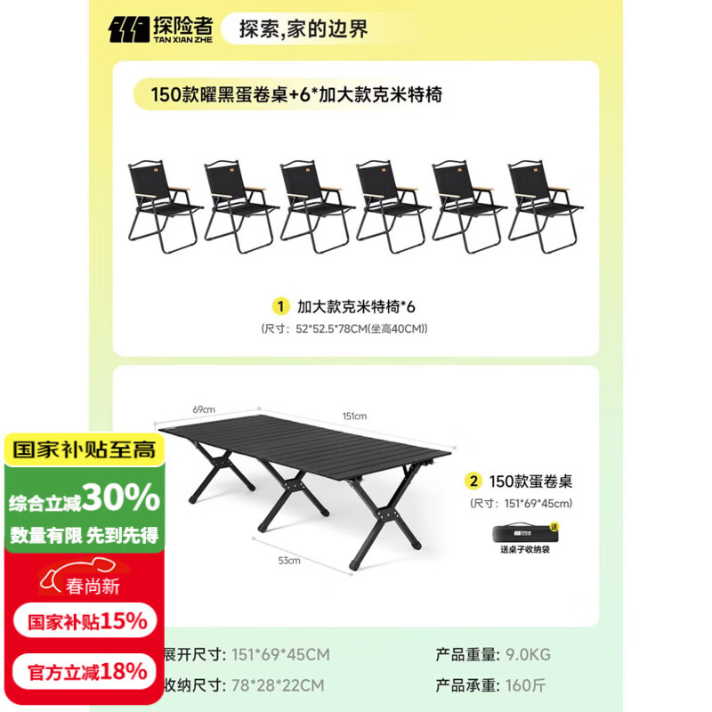 探险者(TAN XIAN ZHE)户外蛋卷桌折叠桌便携式桌椅套装露营桌子一套野餐桌装备全套摆摊 150黑色蛋卷桌+6加大黑色克米特椅