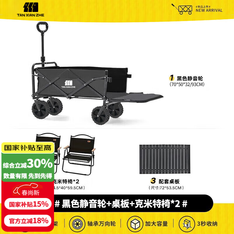 探险者露营车折叠推车户外露营儿童小推车营地车拉年货小拖车聚拢型推车 250L 曜石黑窄轮+桌板+克米特椅*2