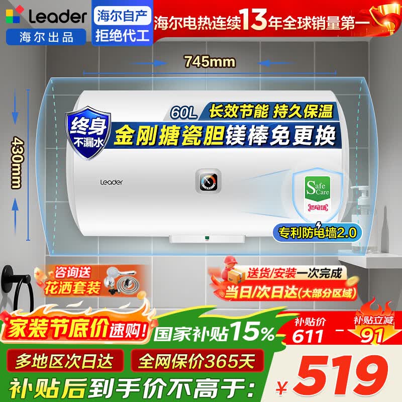 海尔(Haier)【咨询领补贴】统帅热水器电热水器储水式免清洗以旧换新上门安装一级能效变频节能速热家用 60L 2200W 租房优选【舒适节能】3-4人洗