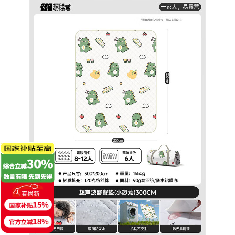 探险者(TAN XIAN ZHE)野餐垫户外加厚超大便携露营垫春游野炊草坪地垫防水防潮垫爬行垫 【7层加厚不硌人】小恐龙200*300cm【厚约5mm】
