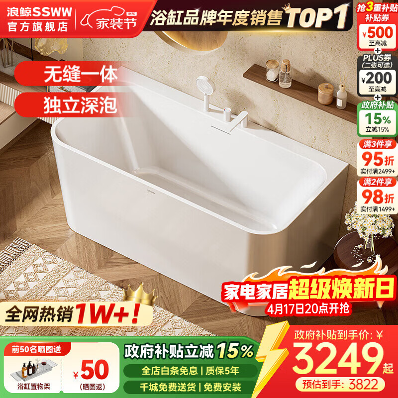浪鲸(SSWW) 卫浴家用成人亚克力方形浴缸无缝一体泡澡浴缸含下水器0220鲸沐 【1.5m配件缸】