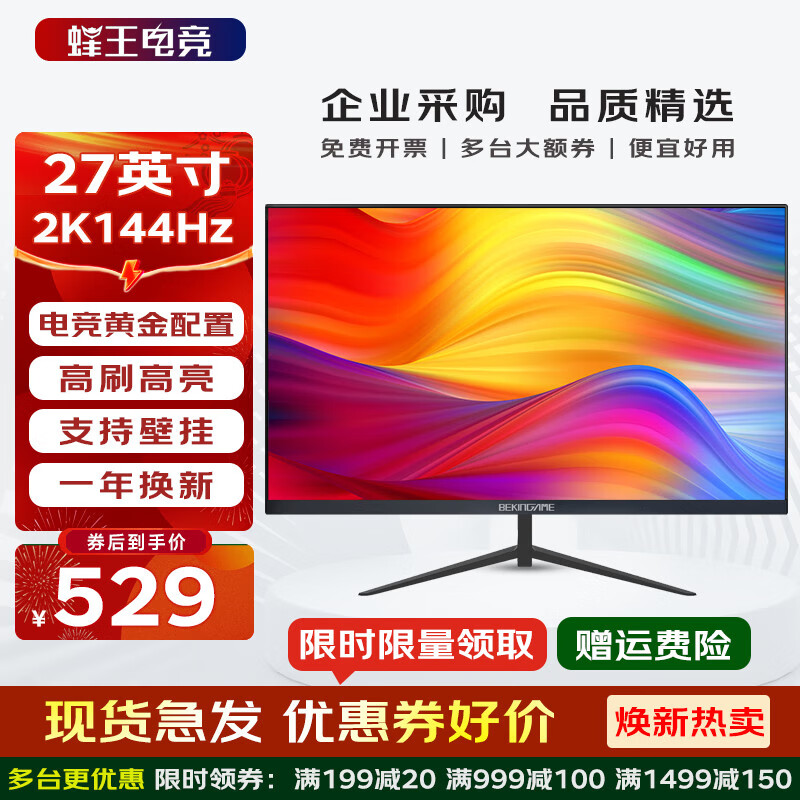 蜂王电竞显示器电脑屏幕主机办公显示屏 高刷电竞游戏屏 高清HDMI笔记本外接副屏设计影视娱乐家用壁挂监控 【高配电竞】27英寸2K144Hz直面屏