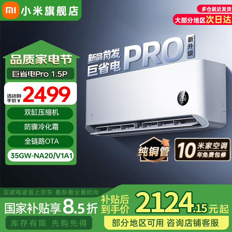 小米(MI)米家新款1.5匹巨省电 双排款 健康风 变频冷暖智能互联自清洁一级能效壁挂式卧室客厅家用空调挂机 1.5匹 超一级能效 25款巨省电Pro【 双缸压缩机 】