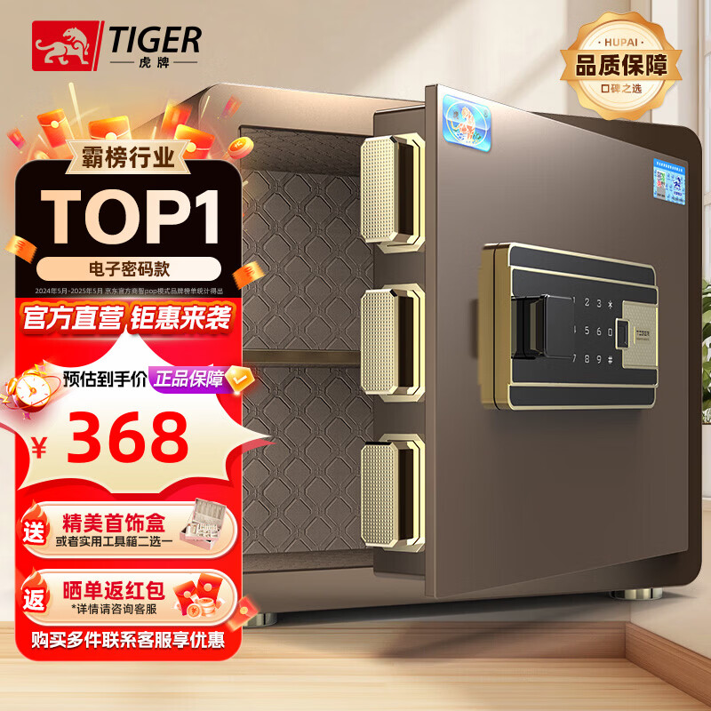 虎牌保险柜家用小型指纹密码WIFI全钢防盗可入墙办公大型保险箱新款保管箱 35cm磨砂咖 指纹/钥匙/密码/临时秘钥/(密码+指纹)