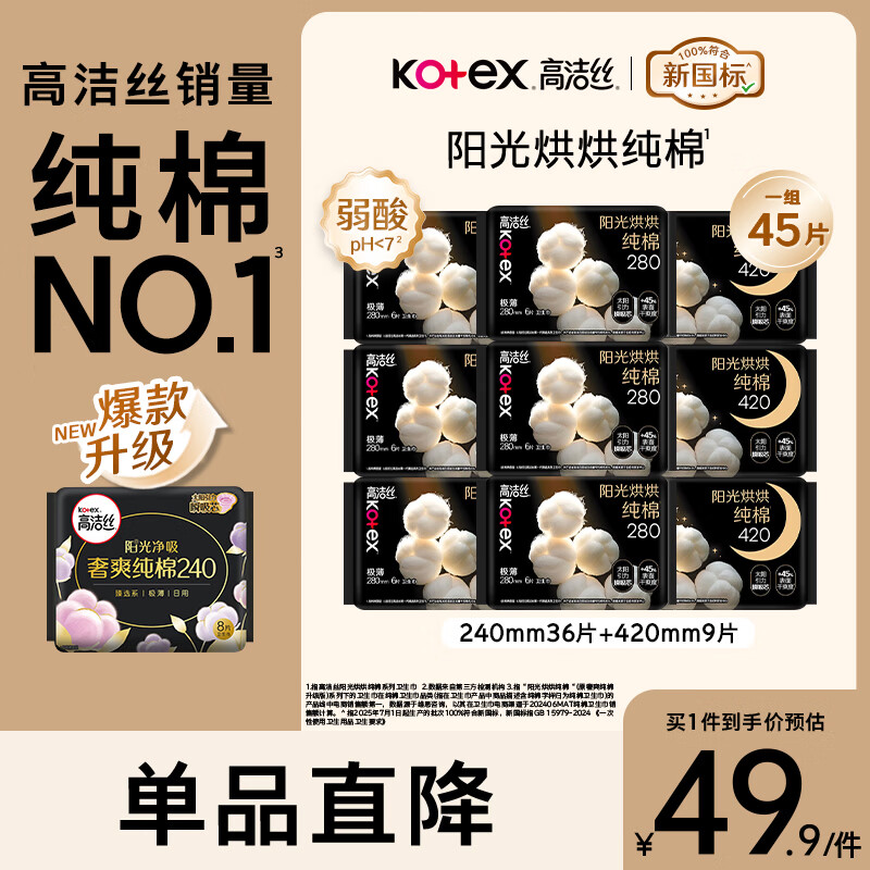 高洁丝(Kotex)卫生巾 臻选纯棉日夜套装极薄透气无感 组合装 【夜用45片】280mm36片+420mm15片