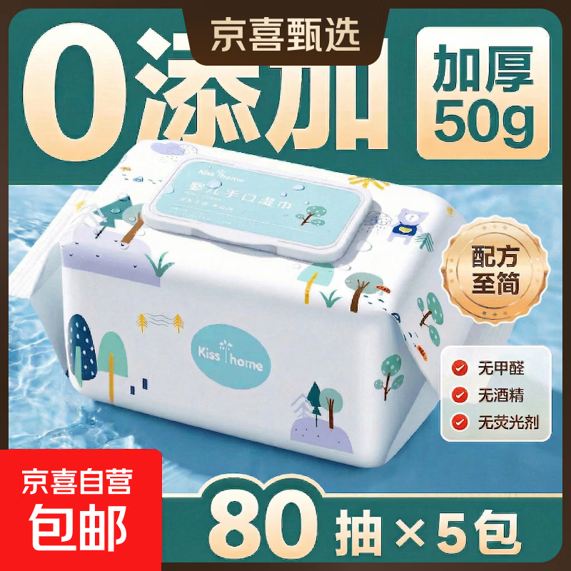 KISS HOME婴儿手口湿巾80抽加厚不掉絮新生儿可用母婴清洁卫生湿巾家用实惠 80抽 5包 加厚50克布 安心擦手口