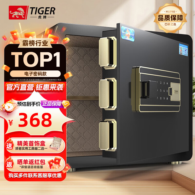 虎牌保险柜家用小型指纹密码WIFI全钢防盗可入墙办公大型保险箱新款保管箱 35cm曜石黑 指纹/钥匙/密码/临时秘钥/(密码+指纹)