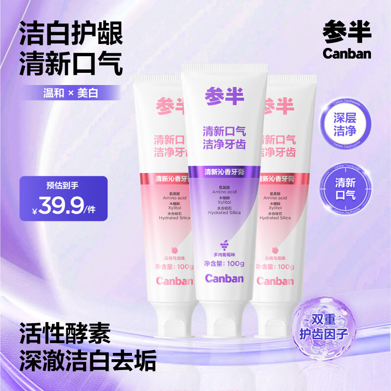 参半清新沁香牙膏酵素洁白去渍清新口气温和清洁 白桃*2+葡萄 100g*3支