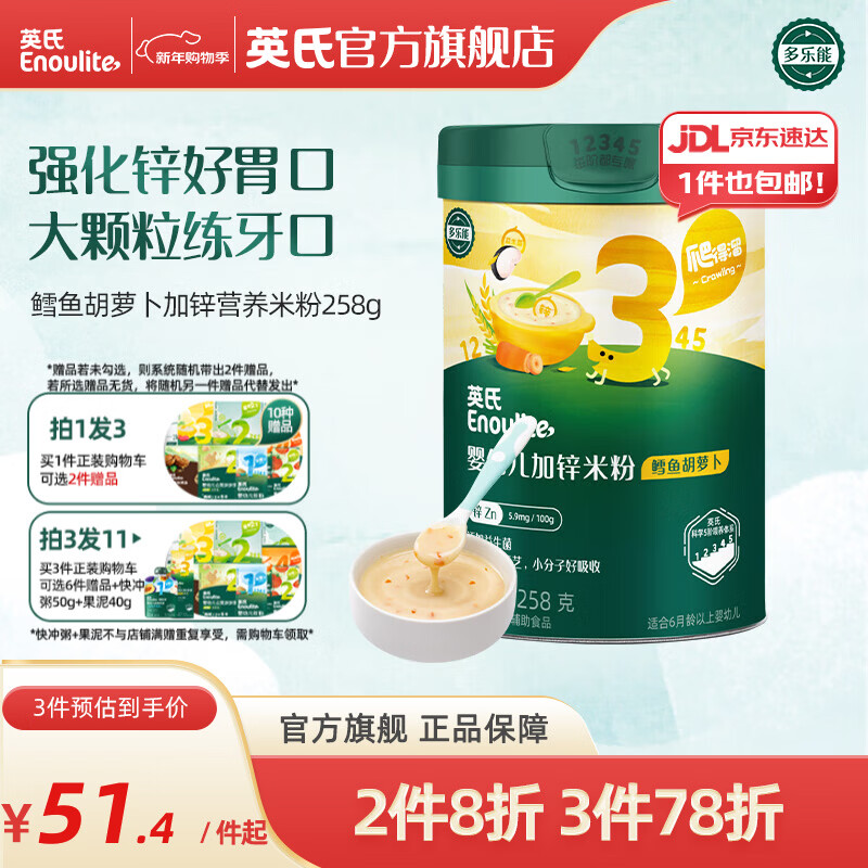 英氏米粉罐装套组婴幼儿高铁米粉6-12个月辅食宝宝营养米糊 3阶10月+鳕鱼胡萝卜 258g*1罐