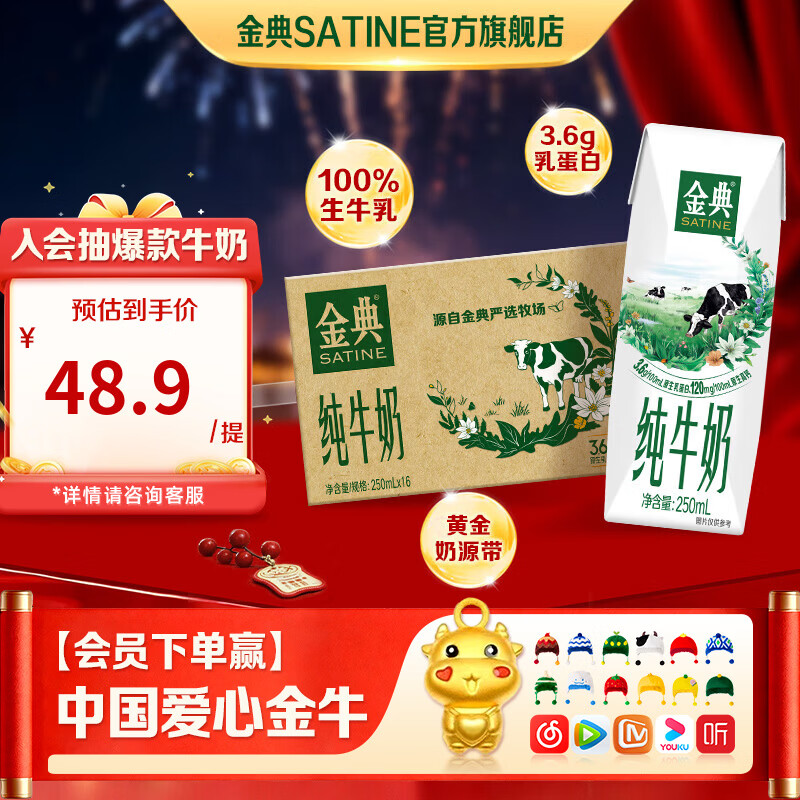 伊利金典纯牛奶 250ml纯牛奶 早餐伴侣 伊利牛奶整箱送礼 金典纯牛奶250ml*16盒/箱 9月产