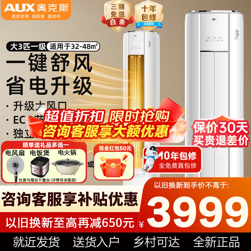 奥克斯(AUX)大2匹/3匹空调柜机 家电补贴15% 新一级能效全直流变频冷暖客厅圆柱立式空调 铜管空调以旧换新 省电侠 大3匹 新一级能效大风口适用32-48㎡